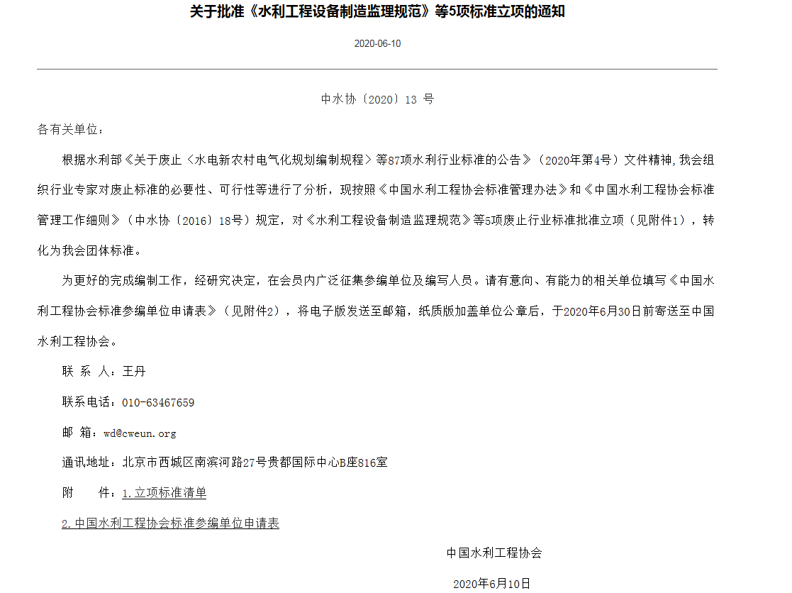 关于批准《水利工程设备制造监理规范》等5项标准立项的通知