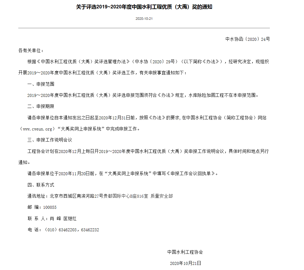 关于评选2019~2020年度中国水利工程优质(大禹)奖的通知