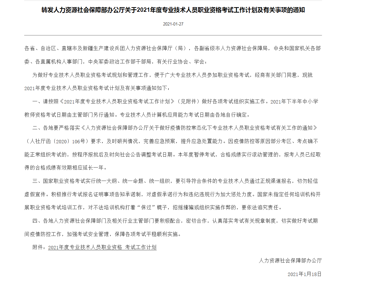 转发人力资源社会保障部办公厅关于2021年度专业技术人员职业资格考试工作计划及有关事项的通知
