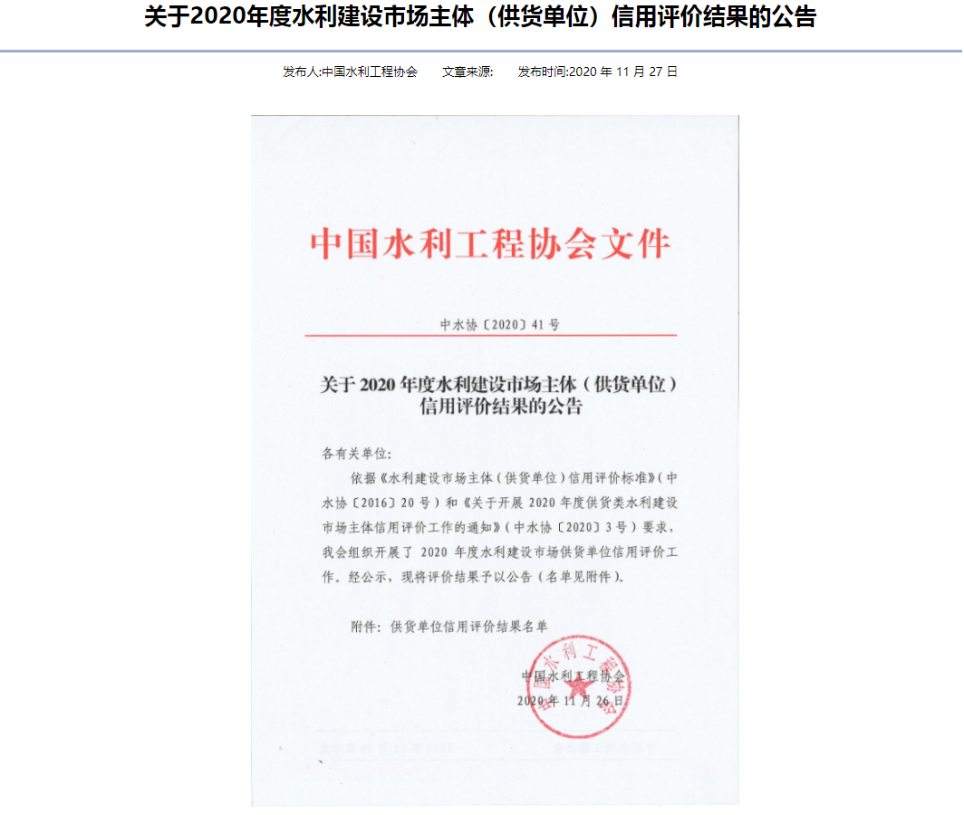 转发 关于2020年度水利建设市场主体(供货单位)信用评价结果的公告
